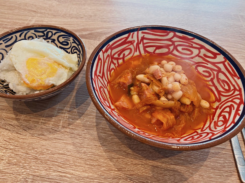 정석 같은 거 없고 고기, 햄, 병조림 콩 등 넣고 대충 끓이는 부대찌개.