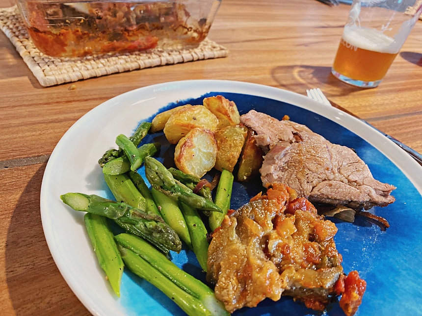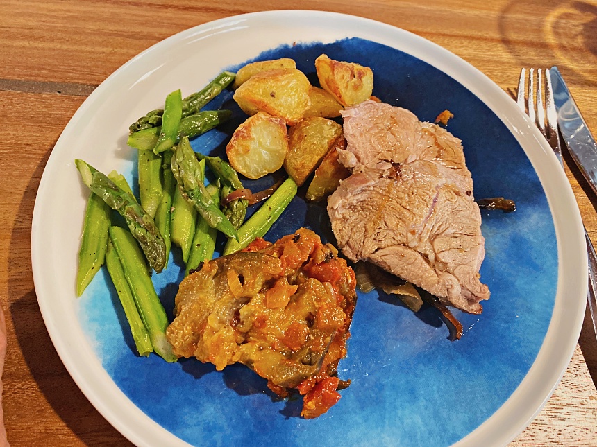 양고기 구이, 이집트식 무사카 (Moussaka), 아스파라거스, 감자 구이.