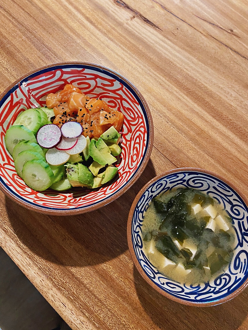 미역과 두부를 넣은 미소된장국과 포케볼(Poke bowl).